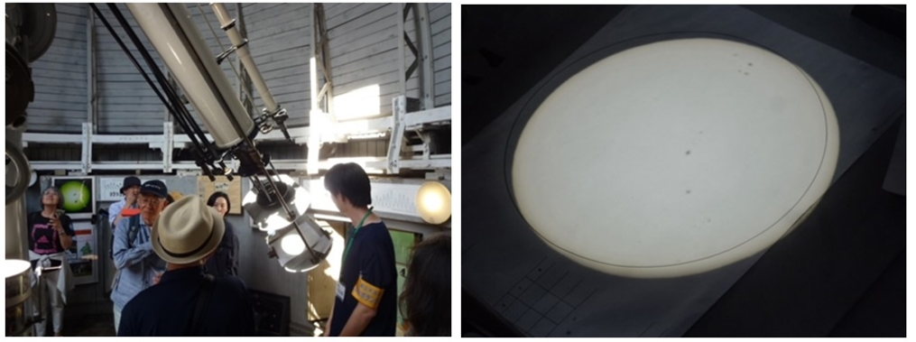 また、天文学の歴史にも触れるため、歴史ある建物や観測装置の見学を行いました。現存最古の建物の「第一赤道儀室」では、1938年から60年間、研究員が手書きスケッチによる太陽黒点の観測が行われてきました。当日は晴天に恵まれ、解説ボランティアの方が20センチメートル屈折望遠鏡を捜査し太陽黒点の“今!”の状況を実際に観測することができました。ちょうど太陽の活発なフレアにより各地でオーロラが観測できたニュースが話題となっており、地球サイズの黒点をリアルタイムで目視でき、改めて“宇宙の謎にせまった”感がありました。