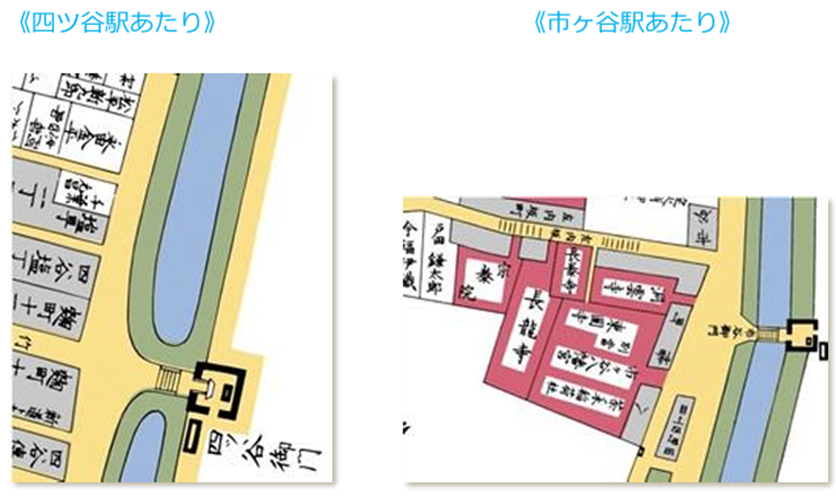 4回目の主な見どころは3つの江戸城外堀御門。中央線は江戸城外堀の一部を埋め立てて線路が敷かれています。四ツ谷駅、市ヶ谷駅、飯田橋駅の3つの駅舎は、江戸の古地図では、外堀の四ツ谷御門、市ヶ谷御門、牛込御門のあたりに築かれました。3つの駅の周辺には当時の御門の石垣の一部がしっかりと残っていることを確認しました。