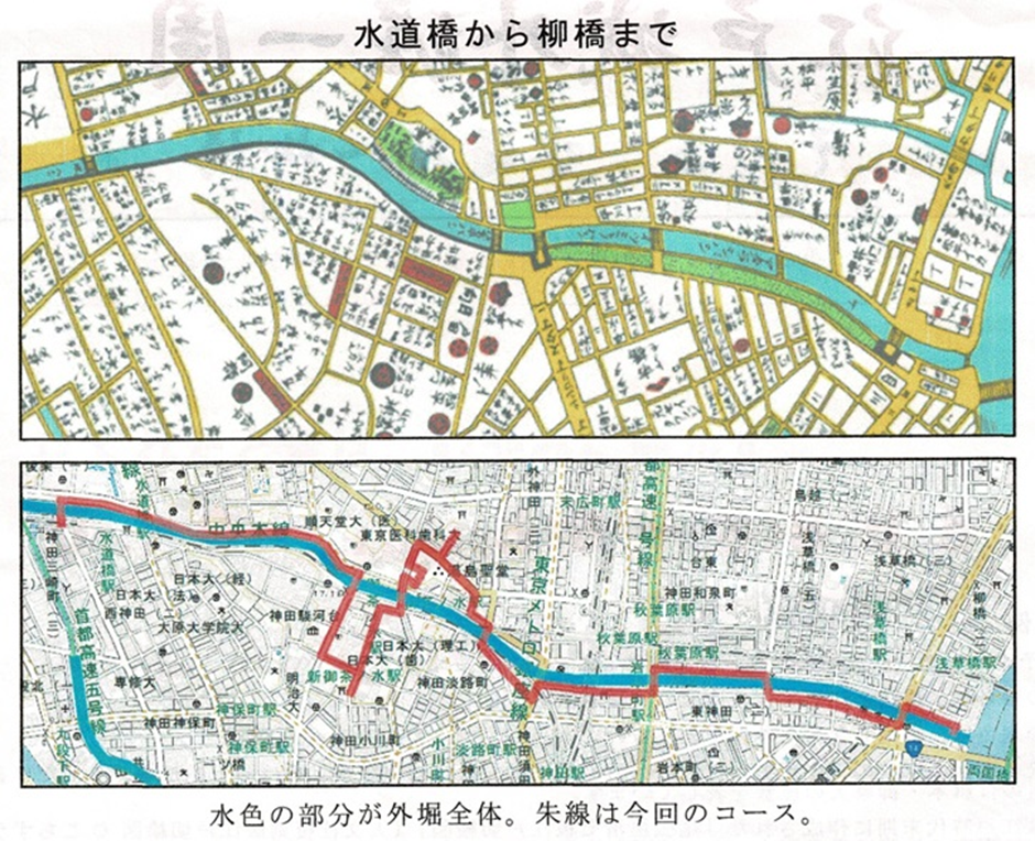 約15キロの江戸城外堀を、5回に分けて散策する古地図散歩コース『江戸城外堀一周』の4回目と5回目、2回分のご報告です。4回目(3/31)は、四ツ谷から水道橋まで。そして、最終5回目(4/29)は水道橋からスタートし隅田川河口の柳橋が終着点。両日ともに好天に恵まれ、楽しい散歩となりました。