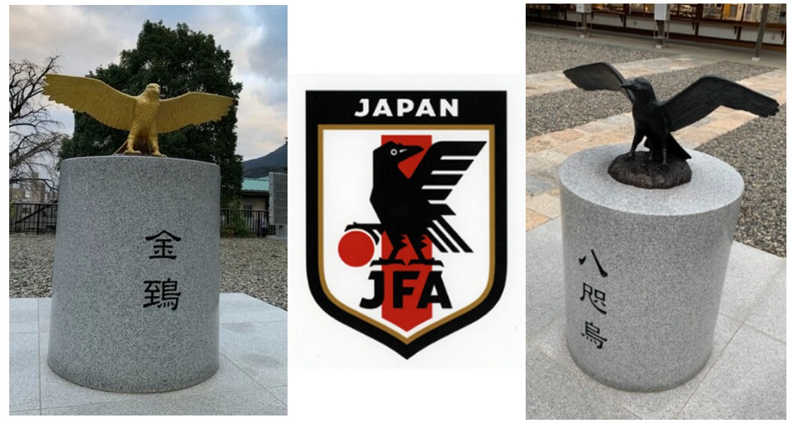 明治35年に東京高等師範学校の中村覚之助が日本で初めてフットボールクラブを創設しました。その後、東京高師の卒業生が各地にサッカーを広め、昭和6年に日本蹴球協会を設立させるにあたって、すでに亡き中村覚之助の出身地、那智にちなんで八咫烏をモチーフにした旗章を作成したとされています。以後、現在に至るまで、八咫烏、そして熊野神社・加茂神社は、トップ選手から末端のサッカーファンまでサッカーの守護神として尊崇を集めています。