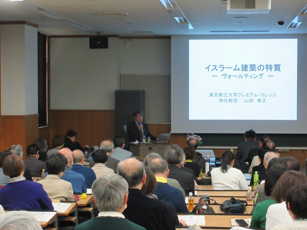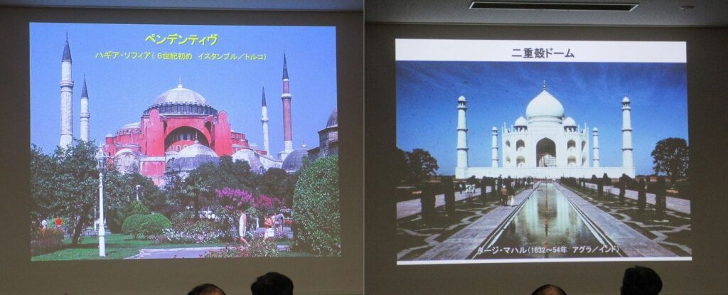 山田幸正先生は、石の文化、木の文化という視点や、古代ギリシャなどからの建築の歴史と進歩、イスラームの勃興と建築文化、その特質であるヴォールティング(曲面架構法)について、たくさんの事例をもとにご講義いただきました。