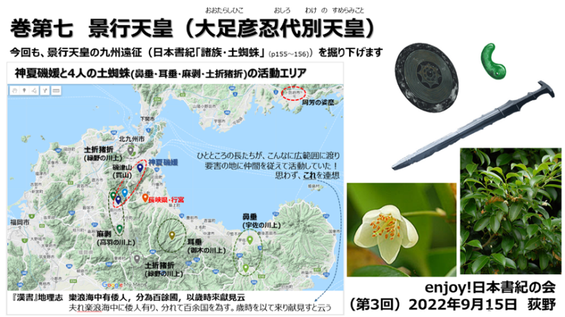 開催日: 2022年9月15日(木)開催場所: オンライン 出席者[入会順、敬称略]: 荻野、関、増山、森本、宮嶋、深田、柳下、鈴木 <発表者> 荻野 第12代・景行天皇...