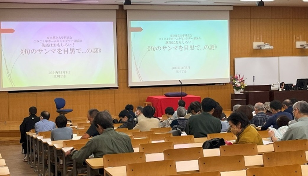 オープニングセレモニー後の記念講演会から参加しました。記念講演会は、都立大出身の落語家である立川寸志さんによる「落語は面白い!」とのタイトルで、前半は落語「目黒のさんま」の高座、後半は目黒のさんまの舞台となった当時の時代背景や目黒の街について、解説のお話があり、実際の落語と、その落語が出来た背景を学ぶことが出来ました。やはりプロの落語は面白いです。 講演会に続いて同窓会会員大会が行われました、理事の先生からの簡単な報告の後に、都立大の学生サークル活動の報告がありました、毎年鳥人間コンテストで上位に入っているサークルや、いきものに関するサークルなど面白い内容でした。いずれのサークルも活動を継続するための費用には苦労していることも良く判りました。