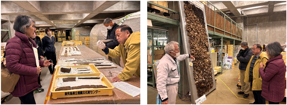 山田先生の教え子の一人でもある鹿児島県立埋蔵文化財センターの館長に館内をご案内頂き、一般公開されていない縄文初期の弓矢などを拝見しました。リニューアルされたばかりの上野原縄文の森展示館内も解説して頂きました。エジプトのピラミッドよりもさらに6000年も前に日本に定住民族がいて数々の土器を作って暮らしていたことに驚愕しました。