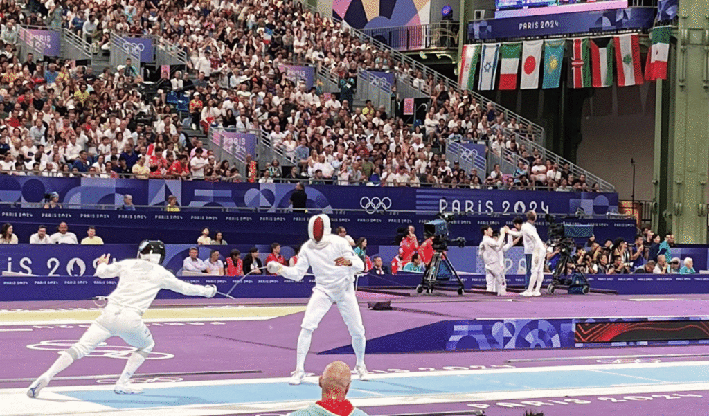 フェンシングの試合、フランス選手が出場中(試合会場のグラン・パレにて)