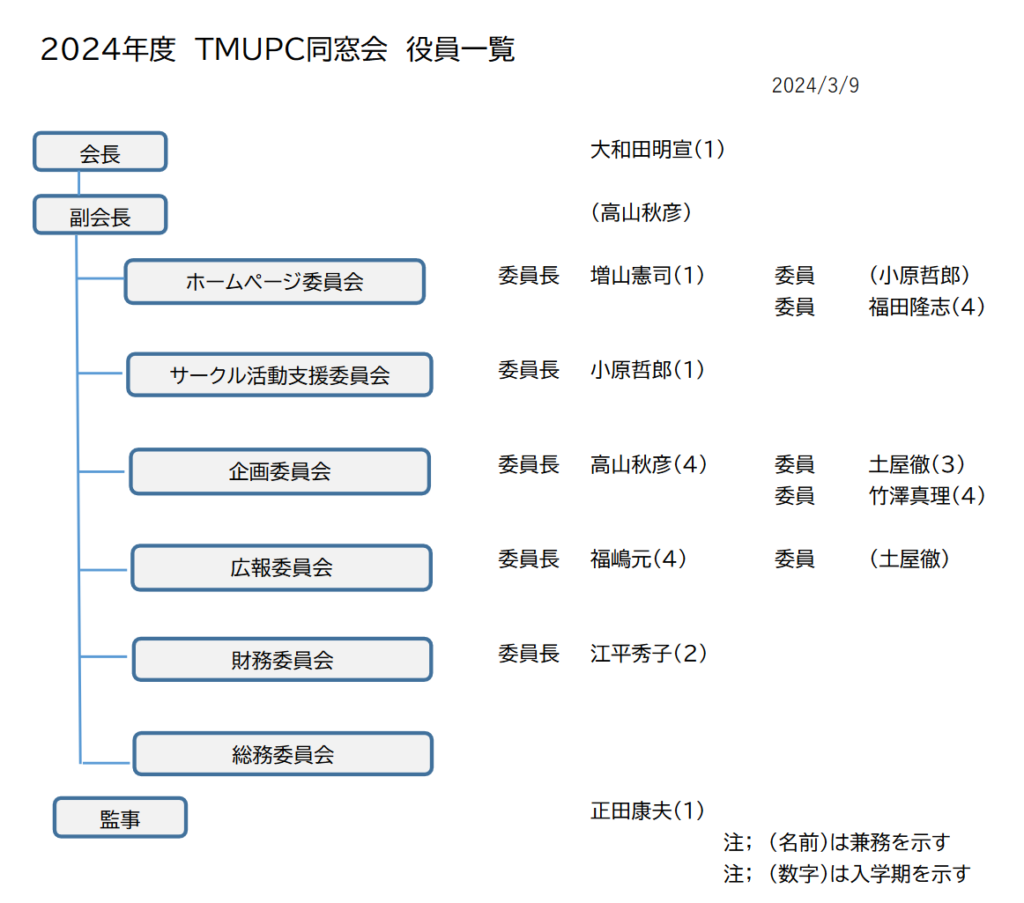 同窓会の活動は、同好会及び同期会活動への支援と同窓会主催企画が主な内容となります。既に5つの同好会が活動を開始しており、1期生、2期生の同期会での懇親会などが実施されていますが、同窓会として企画し主催する活動はこれから始まることになります。活動計画書で大きな目標は設定していますが、具体的な内容は、会員の皆様の要望や意見を役員会にて取り上げる中で作り上げることが可能となります。多くの会員の同窓会活動への参加を期待しておりますので、宜しくお願い致します。